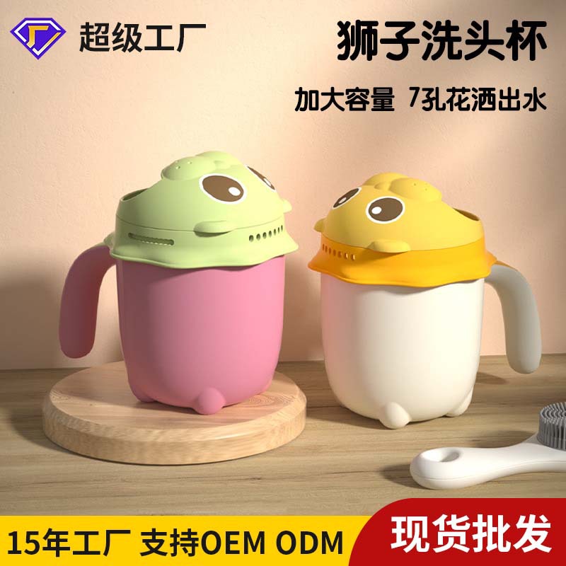 ライオンの漫画は、赤ちゃんのシャンプーカップの花を厚くして、子供の新生児の赤ちゃんをこぼして、風呂の水瓢箪を持ってスプーンをすくった
