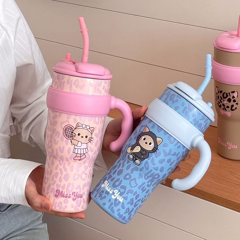 1100ml大容量豹纹冰霸保温杯316不锈钢带茶隔高颜值可爱吸管水杯