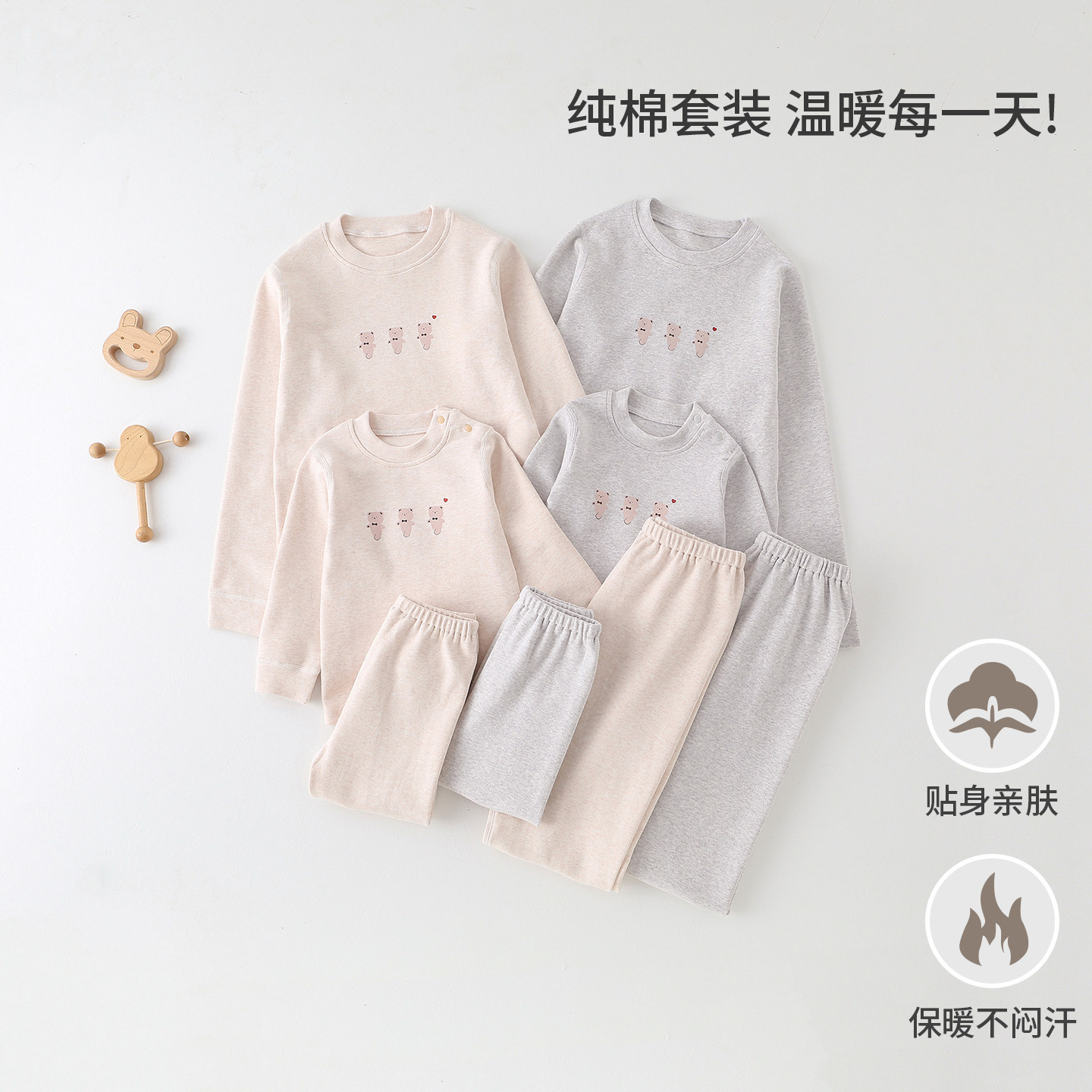 婴得宝男女童套装小熊连连素色弹力棉无骨肩开套圆领保暖家居服