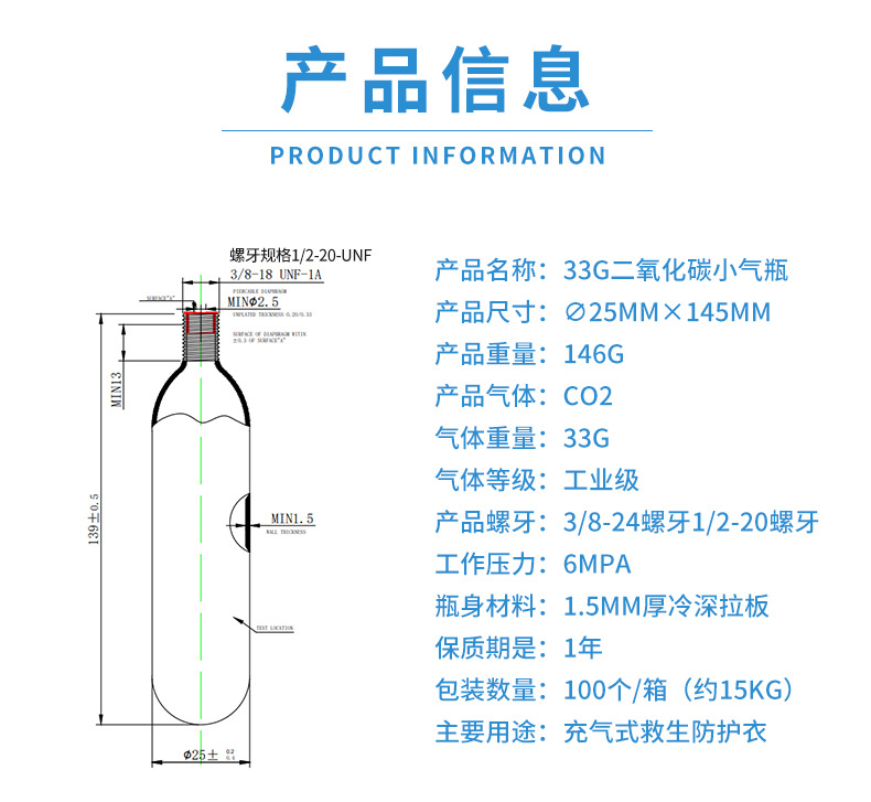 仕様とモデル 33g(1/2-20ネジ二酸化炭素小型シリンダー)*コールドディーププルプレート*6*液化ガスシリンダー*0.048*0.146*25