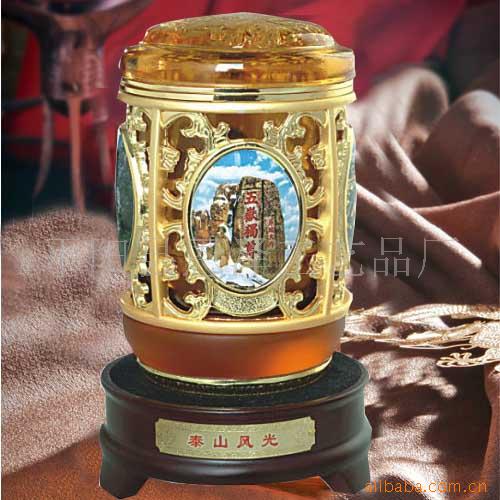 茶叶罐(笔筒)以中国传统名贵材质琉璃或玉石制作,风光部分以刻金属件镶嵌,精工细雕,栩栩如生。饰纹或雅菊惠兰,或花开富贵,镀24k金。整个产品既富有地方特色,有蕴涵传统文化,尊贵又不失高雅,是旅游纪念或馈赠亲有的理想产品