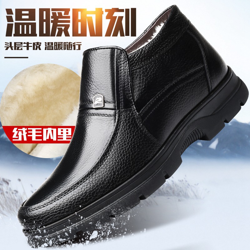 头层牛皮中老年棉鞋羊毛保暖冬鞋加绒爸爸一脚蹬皮鞋防滑冬季真皮