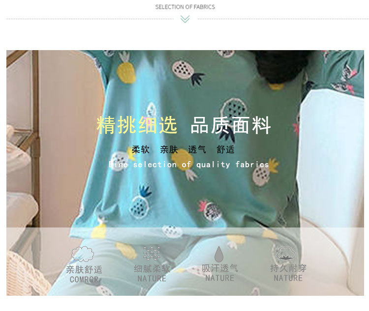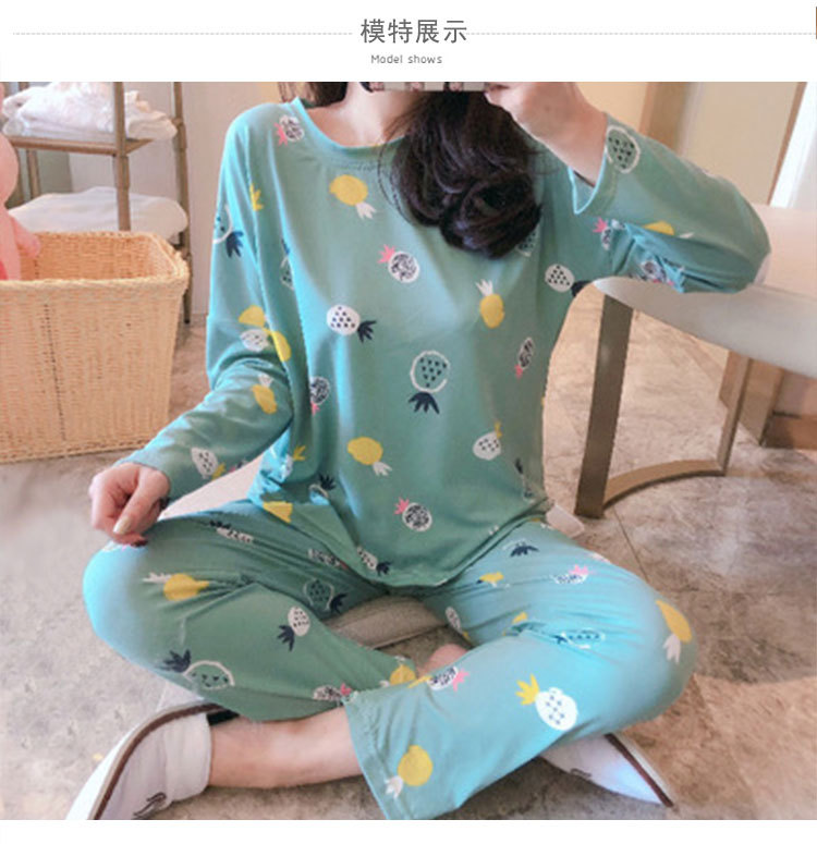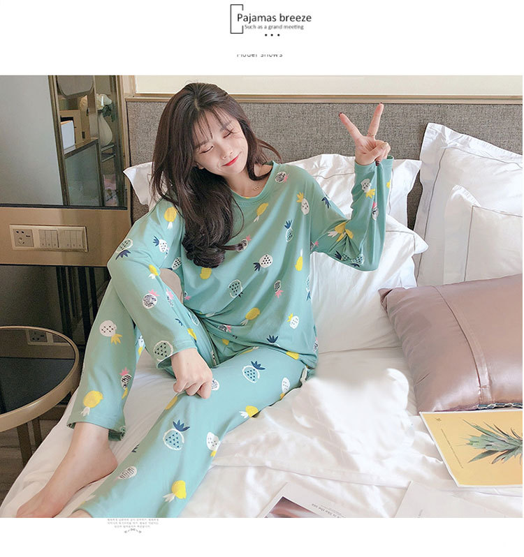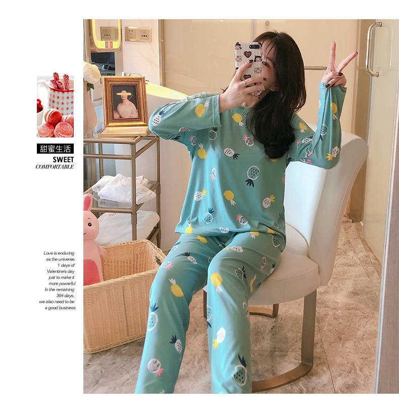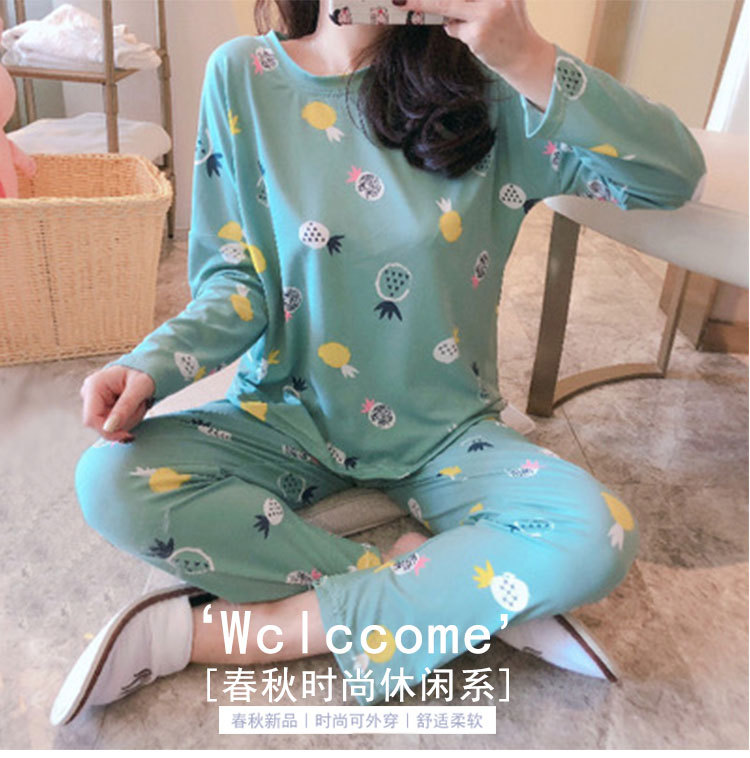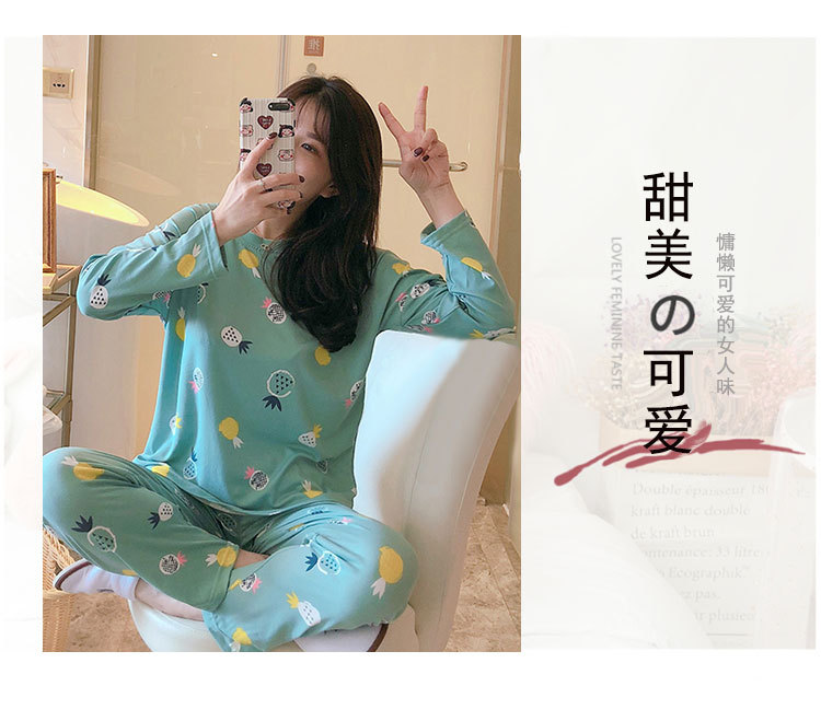 青パイナップル長袖パジャマ女性ミルク糸快適清新風薄手2点セット学生は部屋着を着ることができる