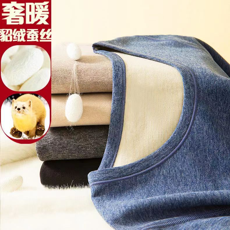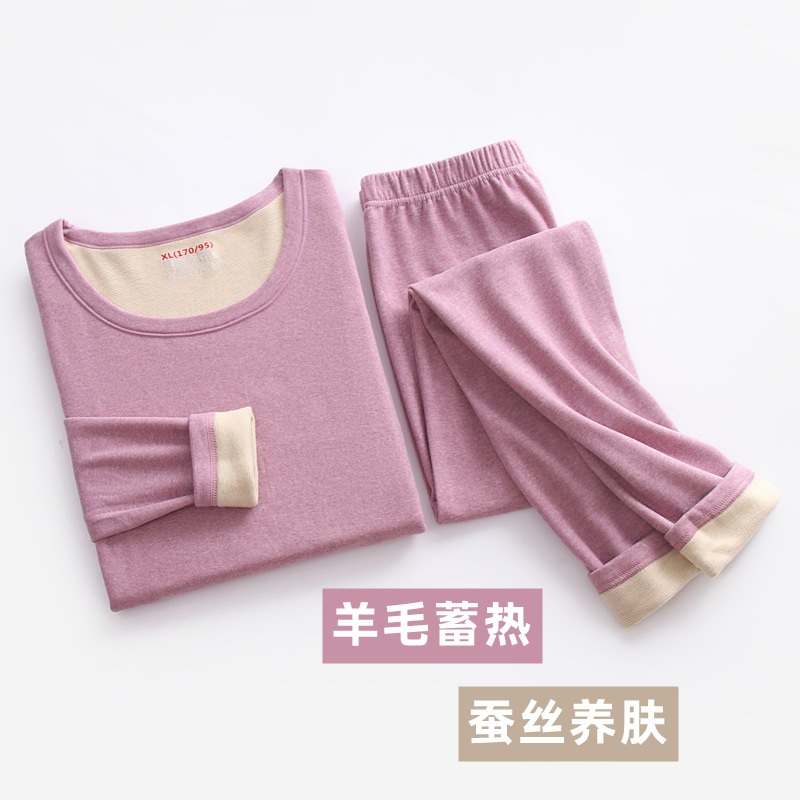 【カシミヤ絹糸】両面パイル男女性丸首保温下着セット秋衣秋ズボン修身徳パイル