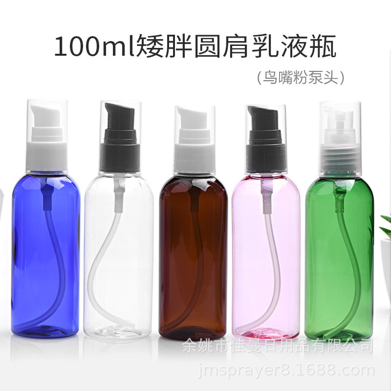 100mlの鳥の口のカモの口の瓶の低い太った丸い肩の乳液は瓶の精華の液体を押して瓶のフルカバーポンプの頭のpetの包装材を分けます。