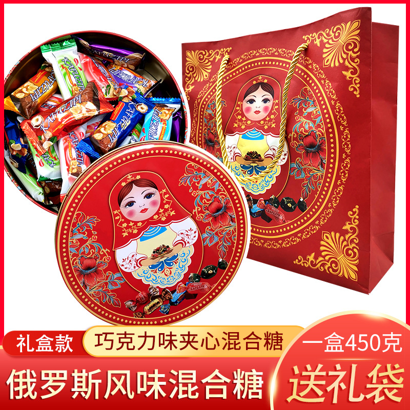 俄罗斯风味混合糖礼盒散装巧克力夹心糖婚新年礼包庆喜糖果铁盒
