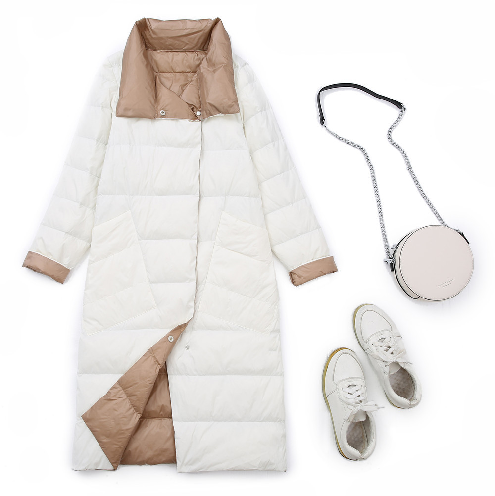 越境秋冬の軽薄な白鴨の羽毛ジャケットの女性の中の長いタイプの斜めのポケットは襟の両面をひっくり返して膝のコートの潮を通します。