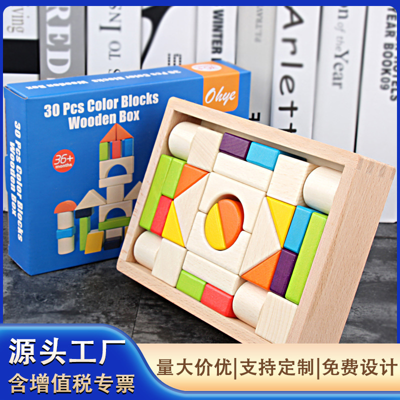 子供の木の30粒のカラーの木の箱の積み木のケヤキの形の認知の大きい塊の山は朝の教育の益智のおもちゃに乗ります。