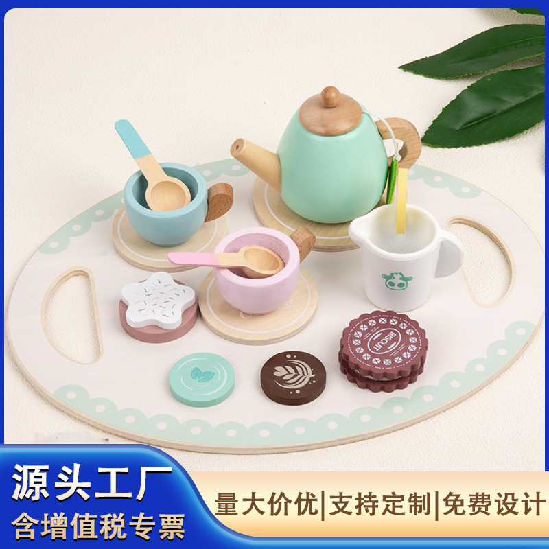早教は子供のままごとの午後のお茶のデザートのケーキをシミュレーションして販売してティーポットの杯のお茶のセットの木製のおもちゃを売ります。