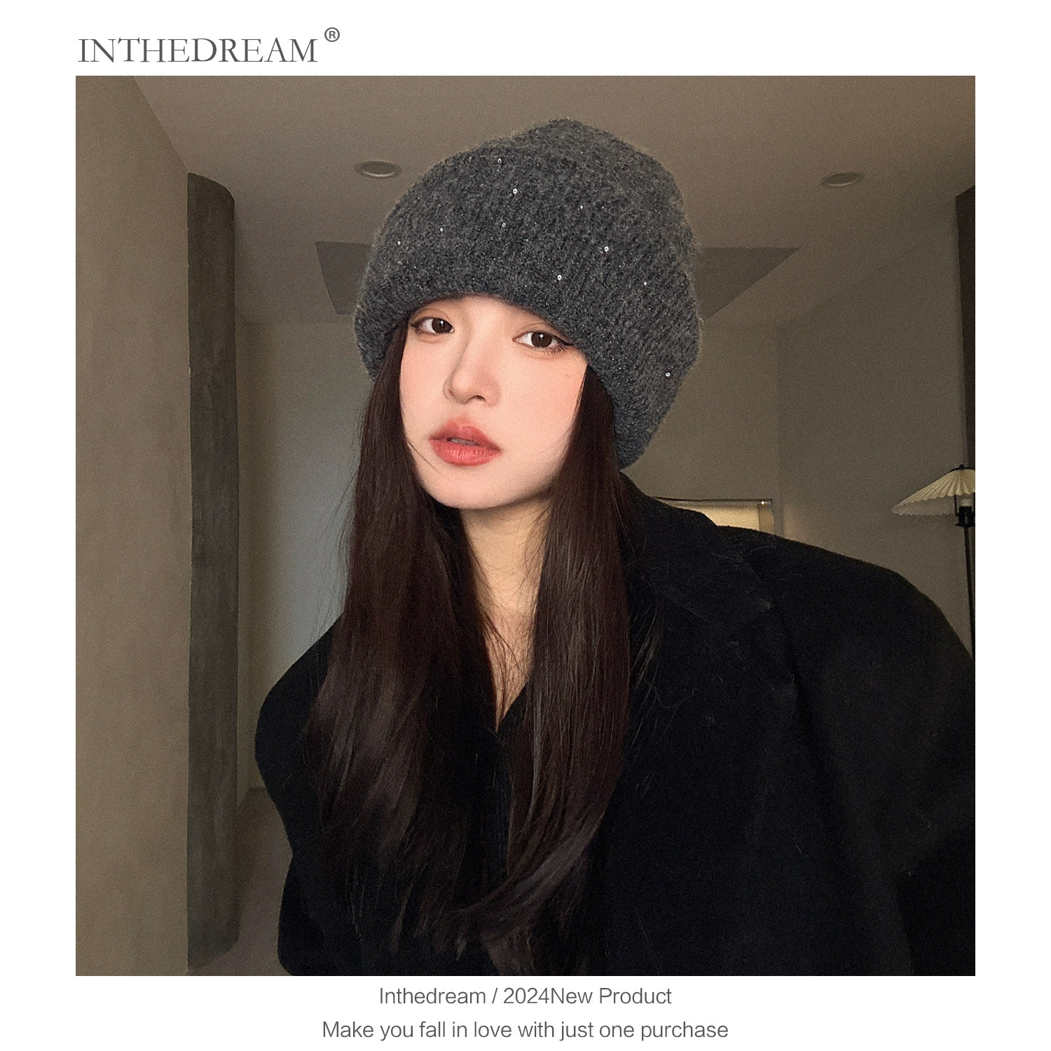 新款冷帽秋冬时尚显脸小包头帽堆堆帽女孩亮闪片针织帽显脸小针织