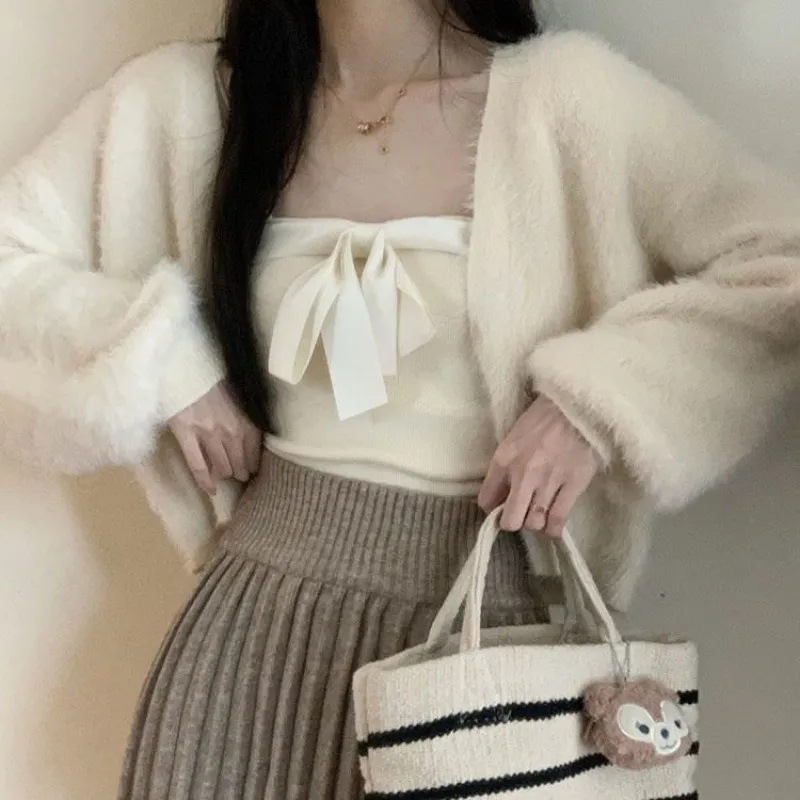 白の甘い長袖ニットカーディガン女性の秋の雰囲気感がゆったりしています。