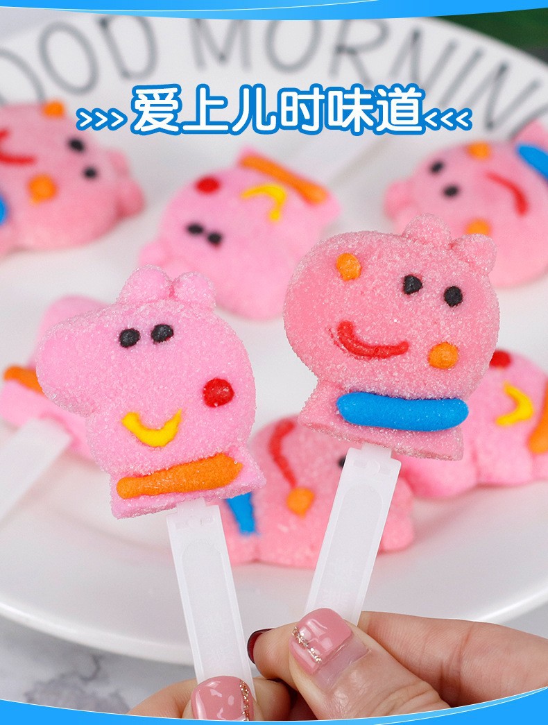 28gはマシュマロの子供の間食のメーカーの直接販売の漫画の形のロリポップのレジャー食品の箱のキャンディーをつなぎます。