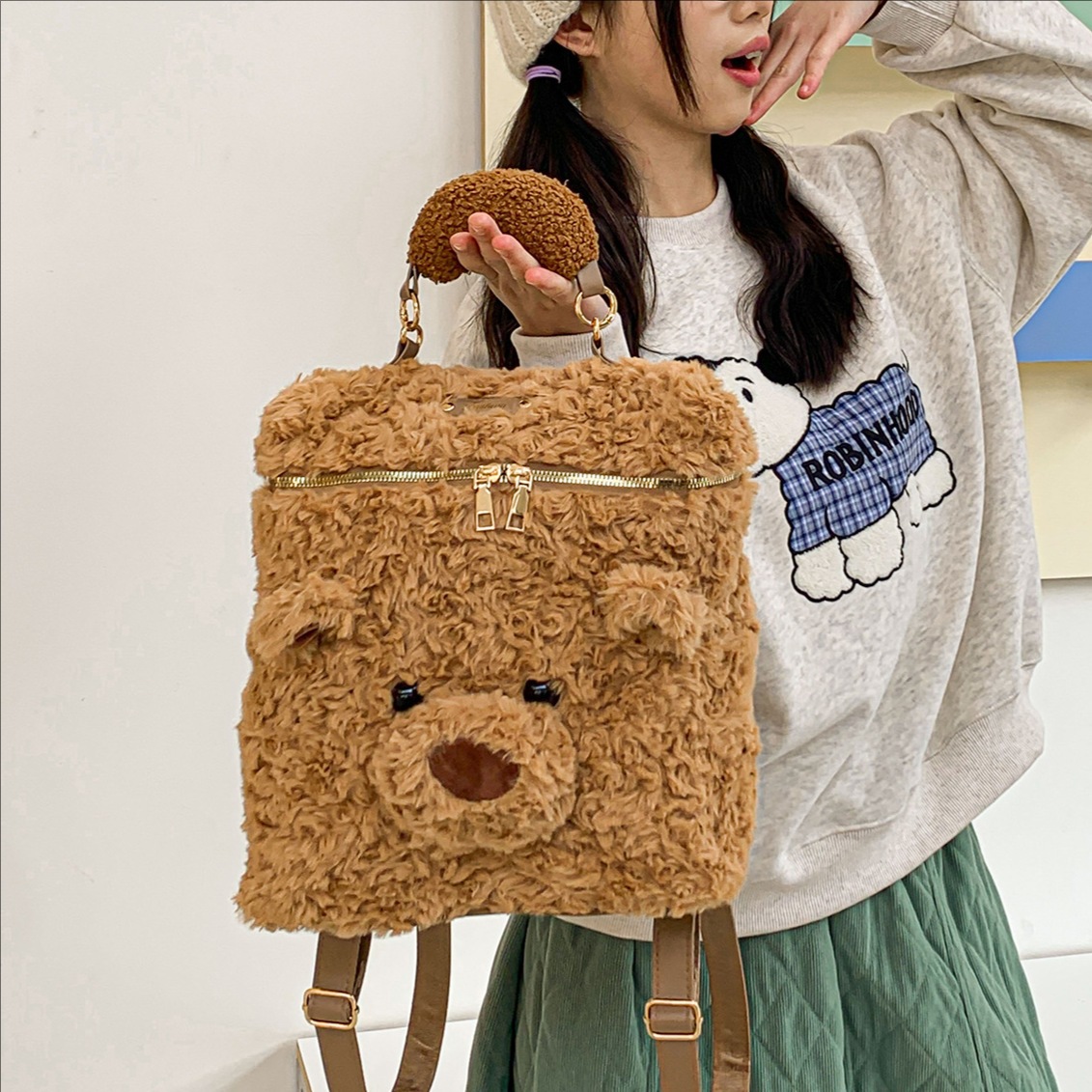 韩版小众设计时尚包包高颜值棕色小熊毛绒双肩包可爱卡通女生背包