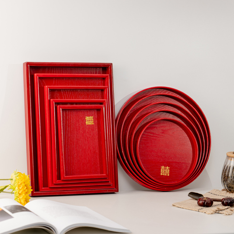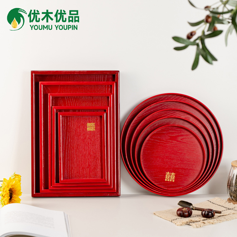 卸売り中国式赤い結婚茶盤長方形円形木製トレイ食器赤皿ホテル結婚用品