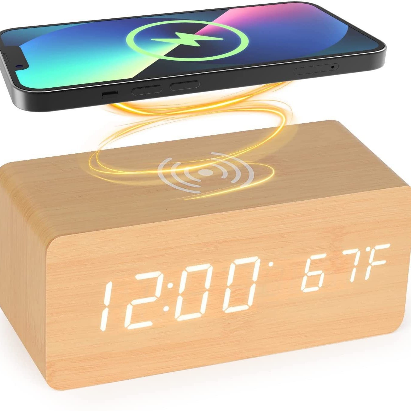 ワイヤレス充電LED時計、クリエイティブな電子充電式木製目覚まし時計、音声制御温度計、充電式木製時計、永久カレンダー