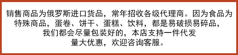 本公司所销售商品为俄罗斯进口货品 常年招收各级代理商 因为食品为特殊商品 .蛋卷,饼干,蛋糕,饮料 都是易破损易碎品,我们都会尽量包装好的,