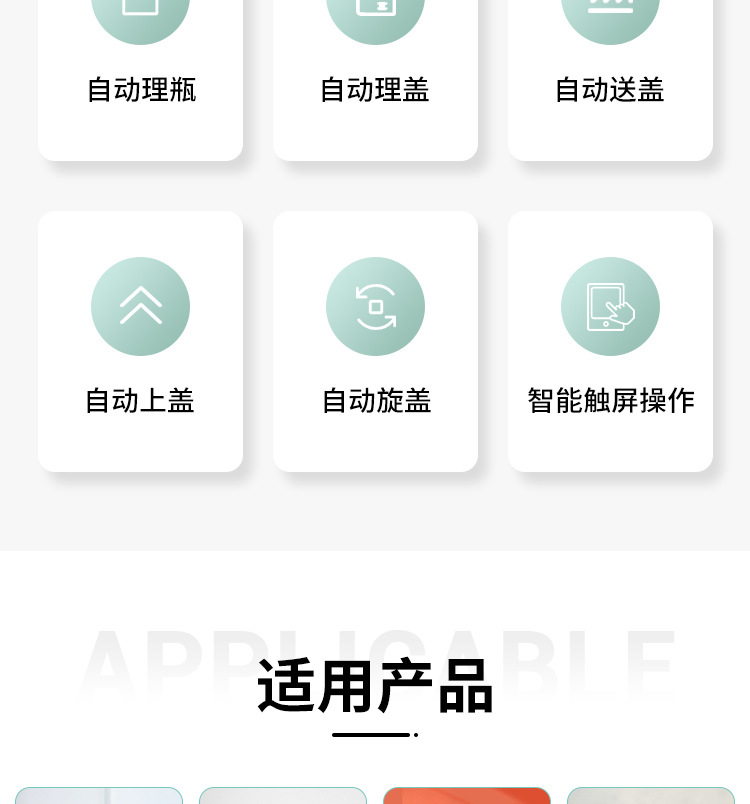 仕様 ボトル仕分け機,キャップオーガナイザー,自動シングルヘッドキャッピングマシン,自動ボトル・キャップ整理・キャップ締め機