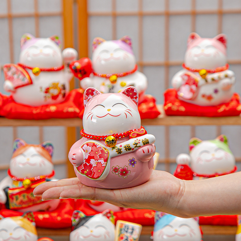 桃の花の猫は友達にプレゼントします。招き猫の女の子は可愛い貯金箱の中の小さいサイズの陶磁器をプレゼントします。