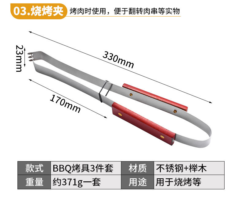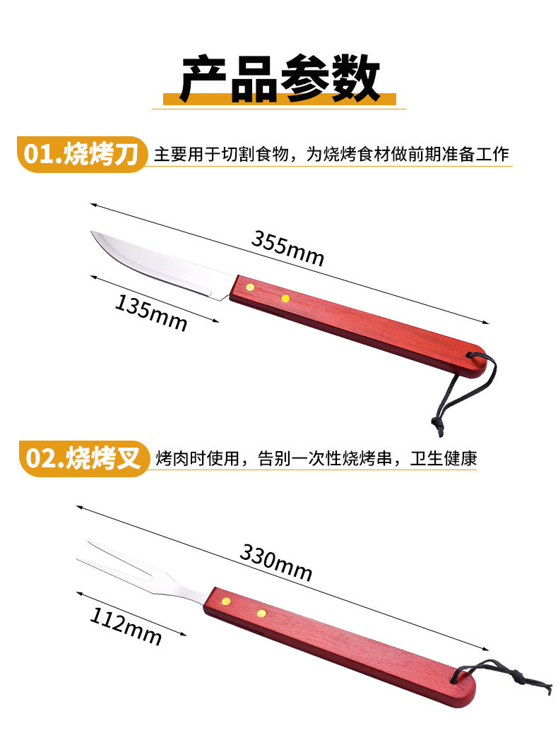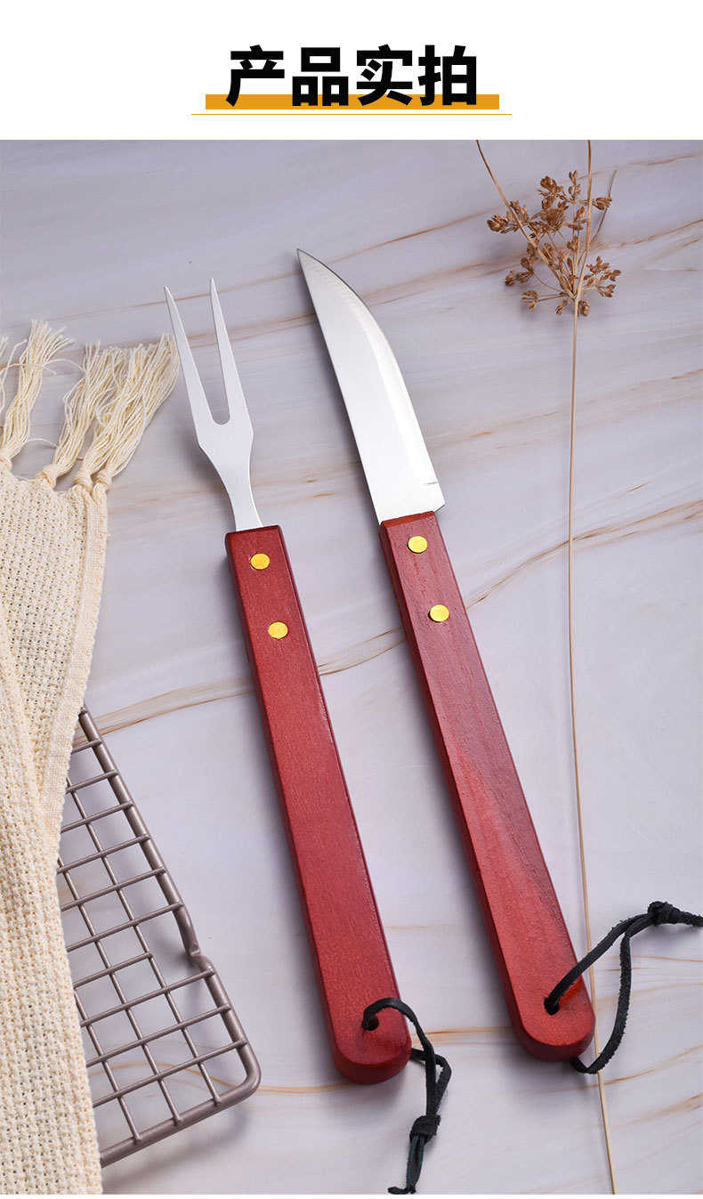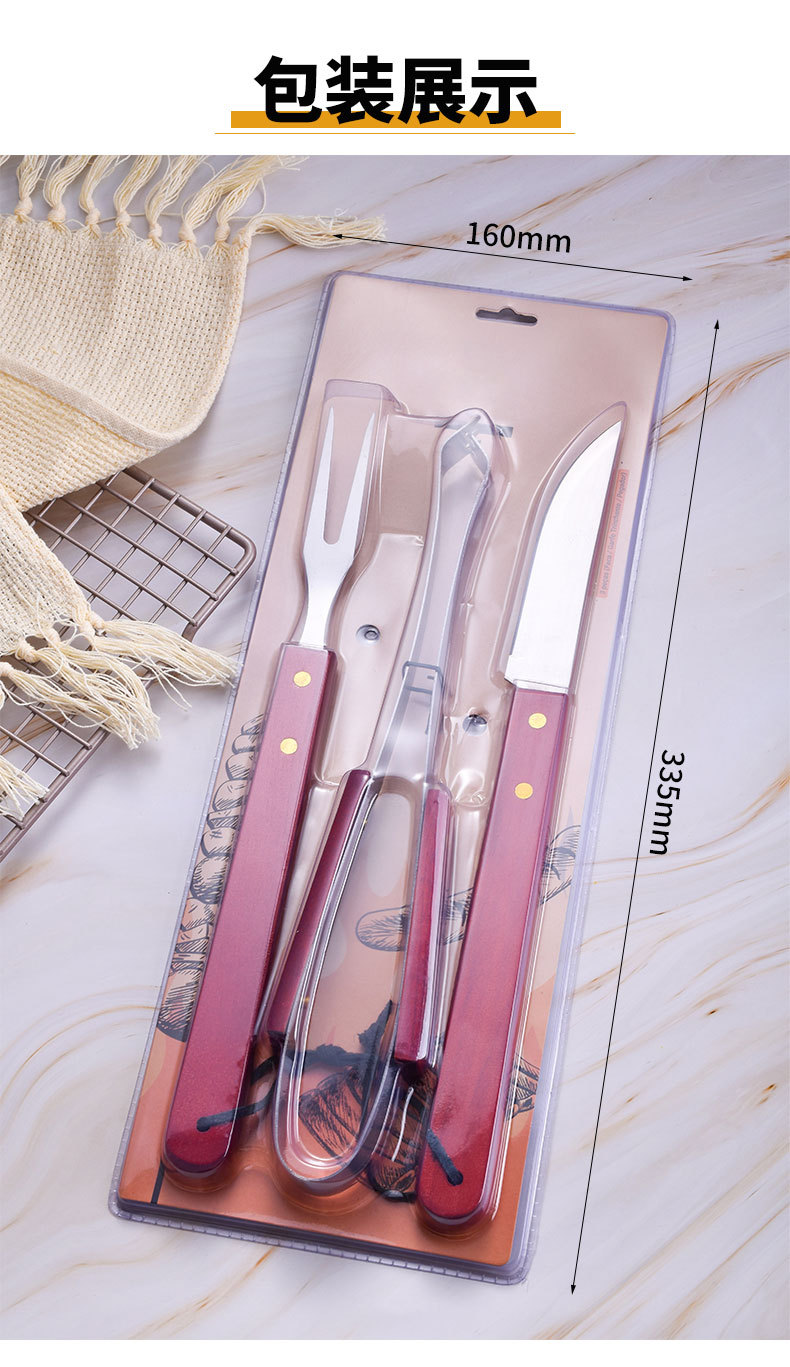 工場価格直売木柄ステンレス三点セットバーベキューツールbbqセットアウトドア家庭用フォークホルダー焼き具