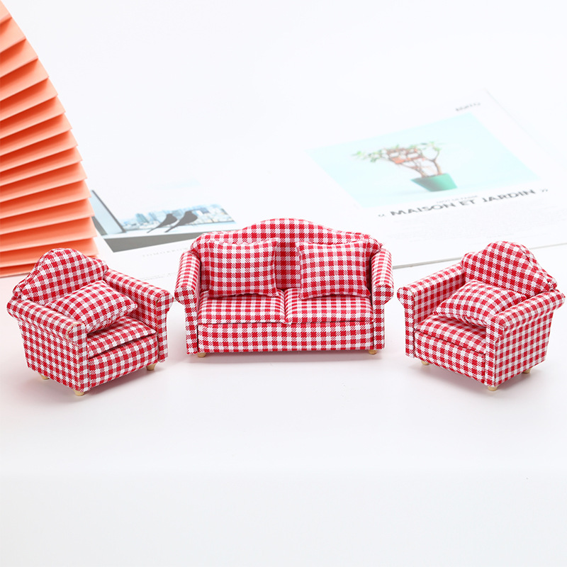 人形屋dollhouseミニ1:12家具モデル置物田園紅白格子リビングソファーセット