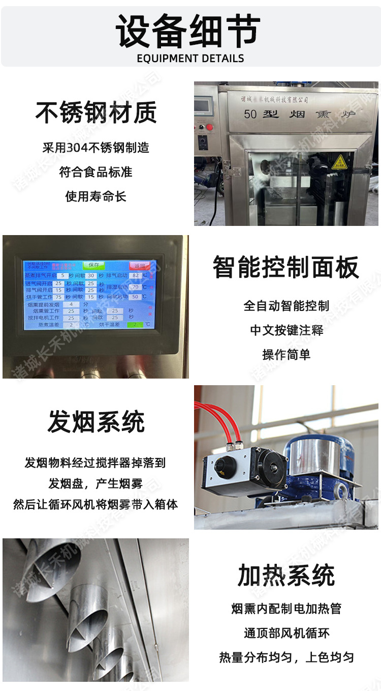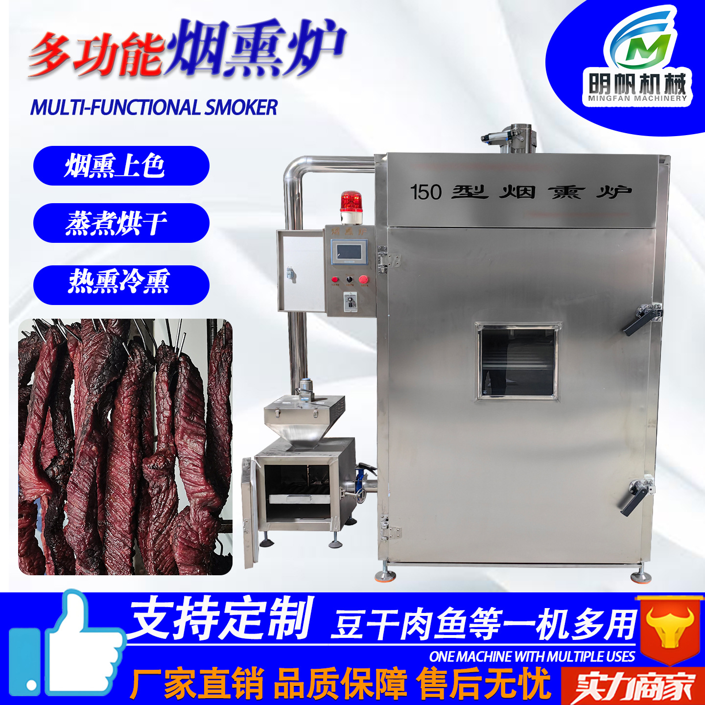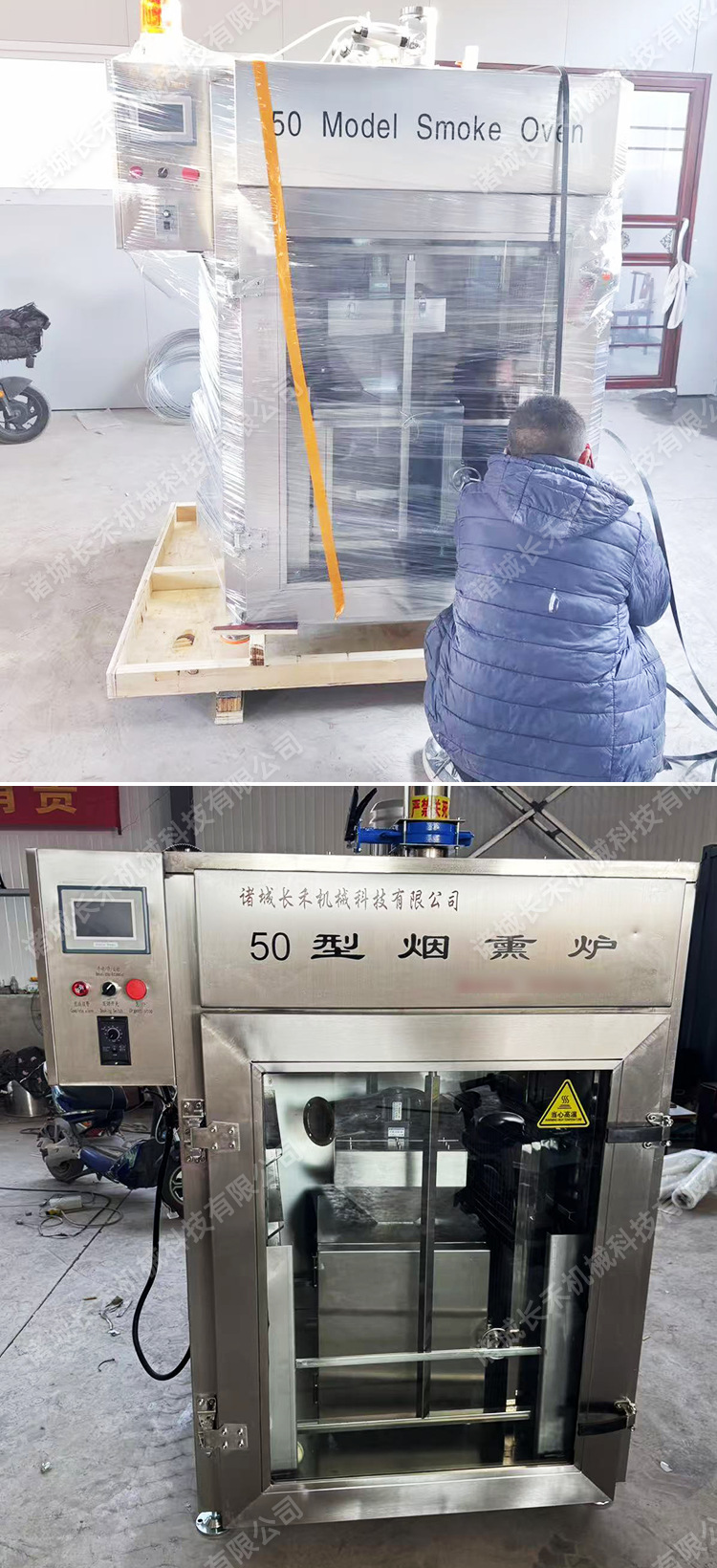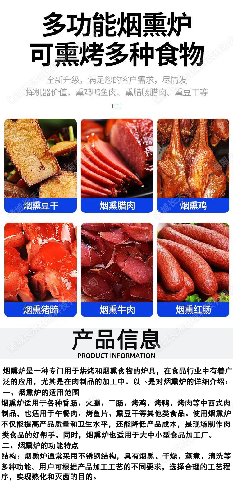 大型全自动烟熏炉 肉制品加工流水线多功能香肠烘烤炉具有能耗低、产量高、易清洗、绝热及密封性能好、升温快、烟熏香浓、自动控温定时控制等特点,本产品是肉类加工企业和个体加工肉类食品(火腿类、熏鸡、熏鸭、熏鹅、熏鱼等)的设备,具有蒸煮、烟熏、烘干功能,烟熏的食品味香色浓,各工艺功能采用自动控制,温度、烟量自动可调,是肉类食品加工提高产品质量的设备。
