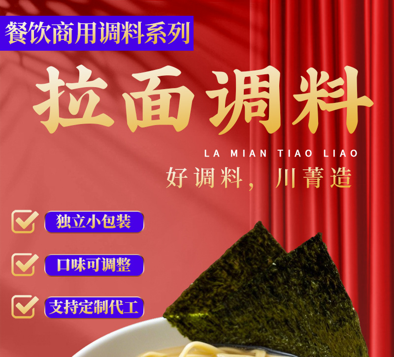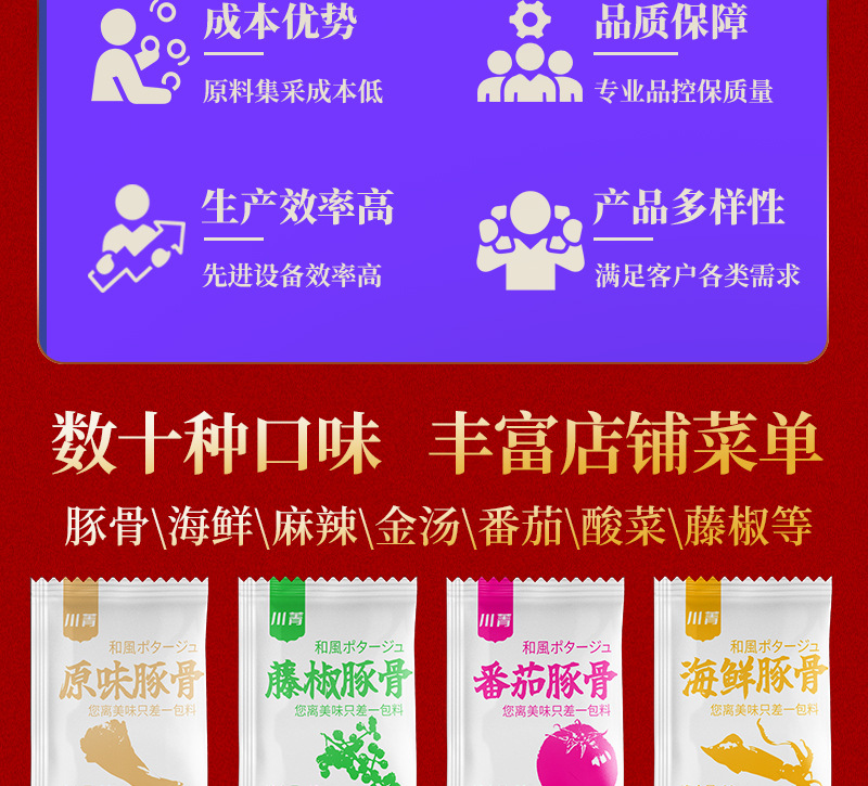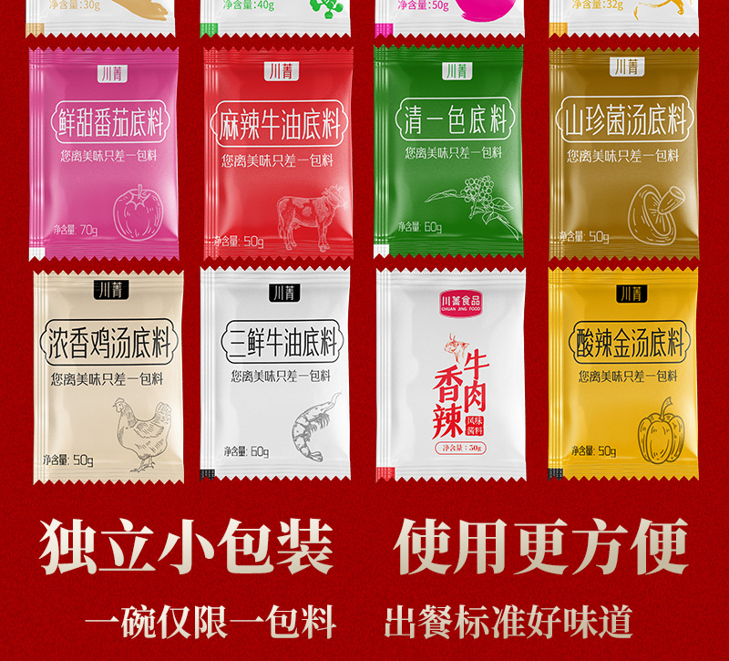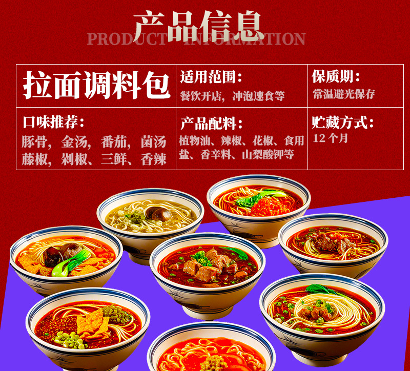 パッケージ仕様 豚骨原湯ラーメン調味料30g,新鮮で甘いトマトのラーメンの調味料70g,麻辣牛油ラーメン調味料50g,麻辣清油ラーメン調味料50g,酸っぱい金湯ラーメン調味料50g,山珍菌スープラーメン調味料50g,濃厚鶏スープラーメン調味料50g,辛い牛肉味ラーメン調味料50g,老壇酸っぱいラーメン調味料50g,二色酸っぱいピーマンラーメン調味料50g,三鮮バターラーメン調味料60g,藤椒清一色ラーメン調味料60g