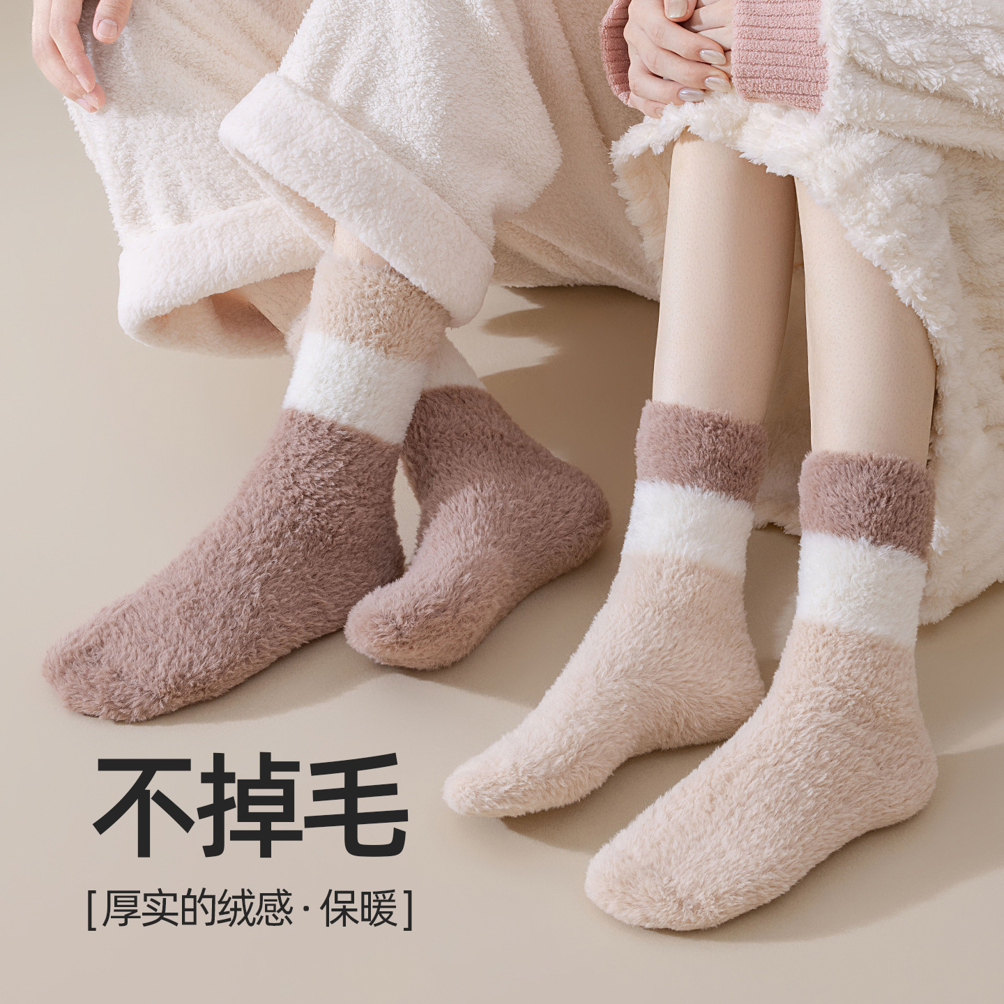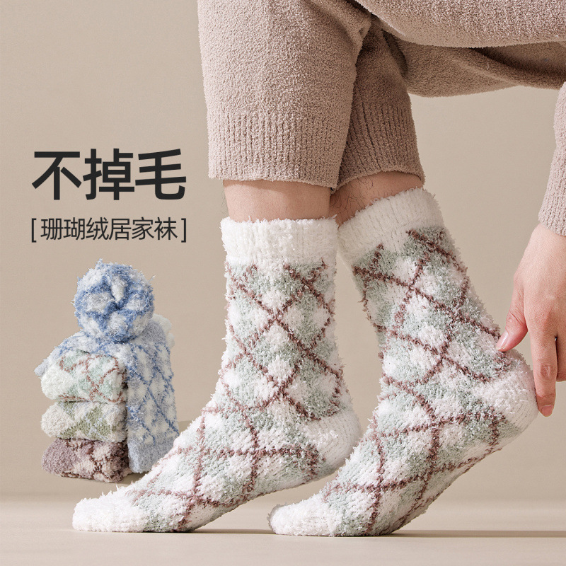 男士珊瑚绒袜秋冬加绒加厚中筒袜居家拼色地板袜保暖不掉毛睡眠袜