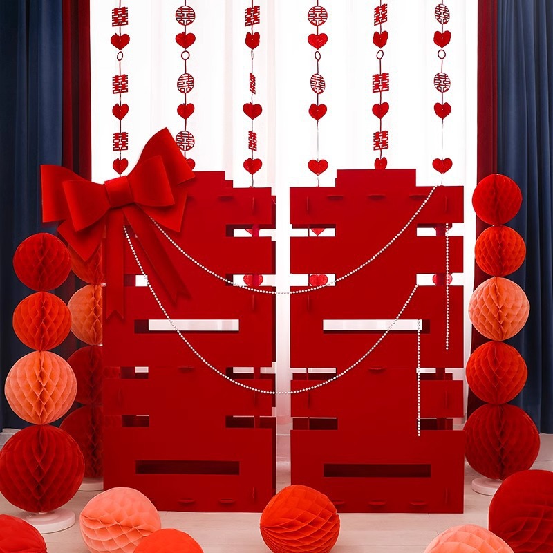 結婚の立体喜字が床に落ちて婚約して結婚式の結婚祝い専用のテーブルを飾ってリビングの結婚部屋の装飾を飾って台を飾っています。