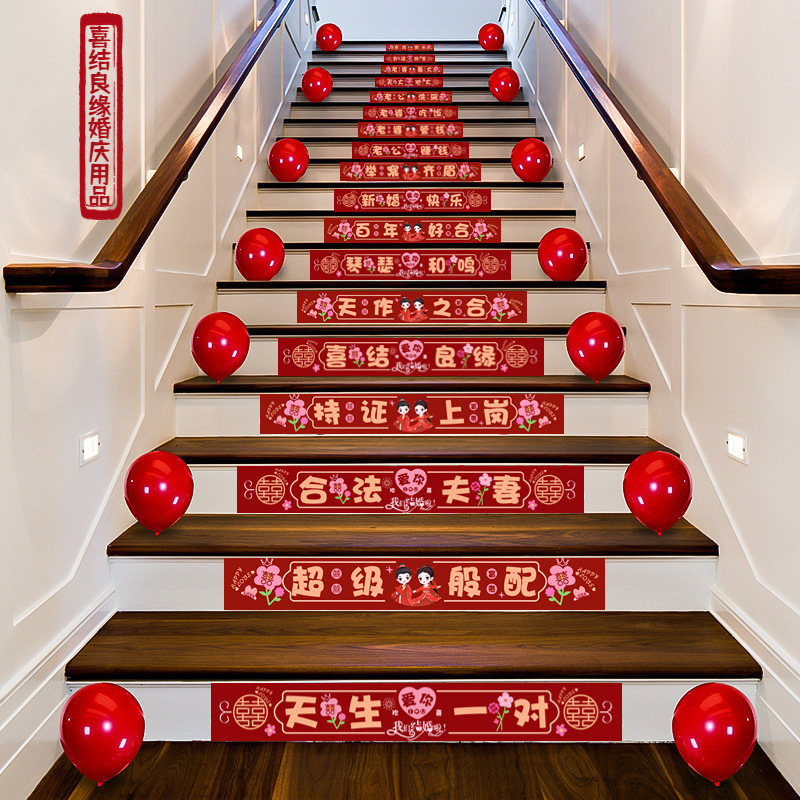 結婚部屋に結婚式の階段のステップシールを配置して手すりを飾ります。