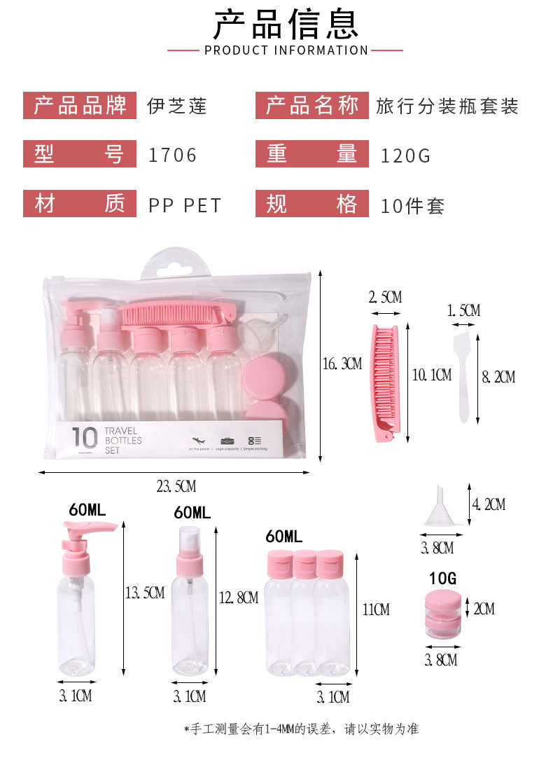 伊芝莲旅行空瓶セット6点セット袋入り化粧品分注ボトルppペットボトル