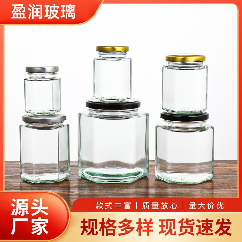 スポット六角ガラス瓶、六角ハニーボトル、六角ジャム瓶、蓋付きチリソース瓶、缶瓶、密封瓶