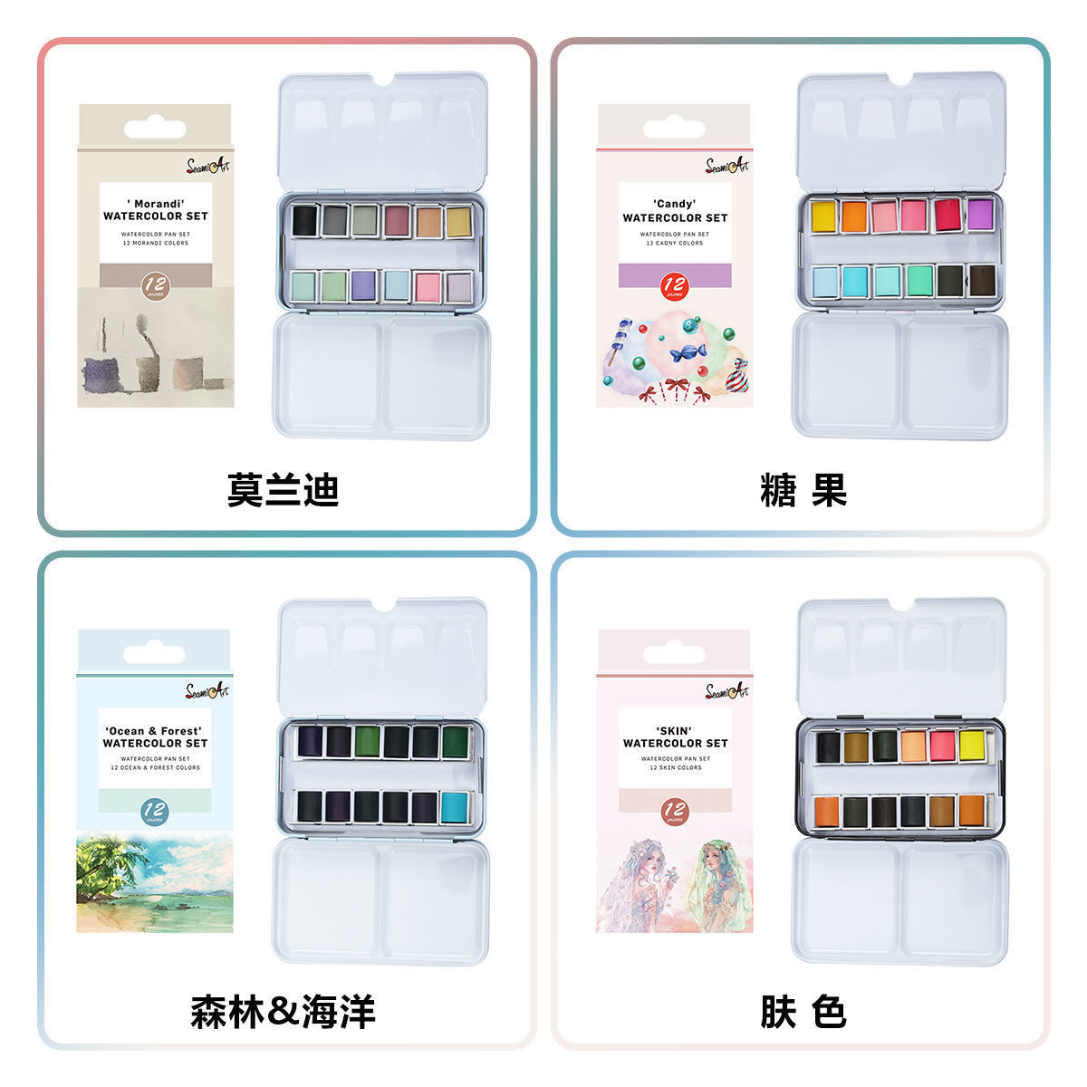 Seamiart 12色人気系固体水彩絵の具鉄箱包装絵画写生水彩絵の具