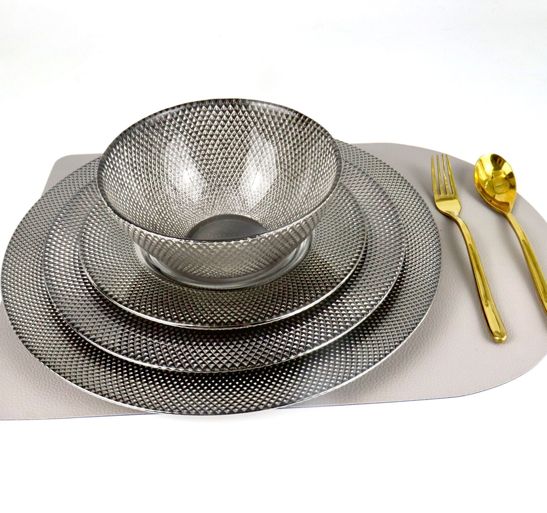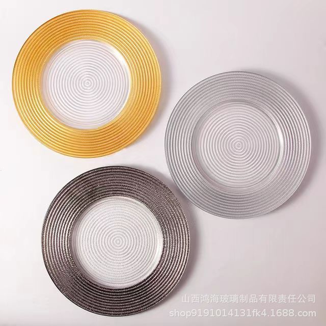 ヨーロッパの金縁のねじ込みガラスプレート、ホームホテルのガラスディナープレート、西洋ステーキパスタディナープレート、マットプレート、フルーツプレート