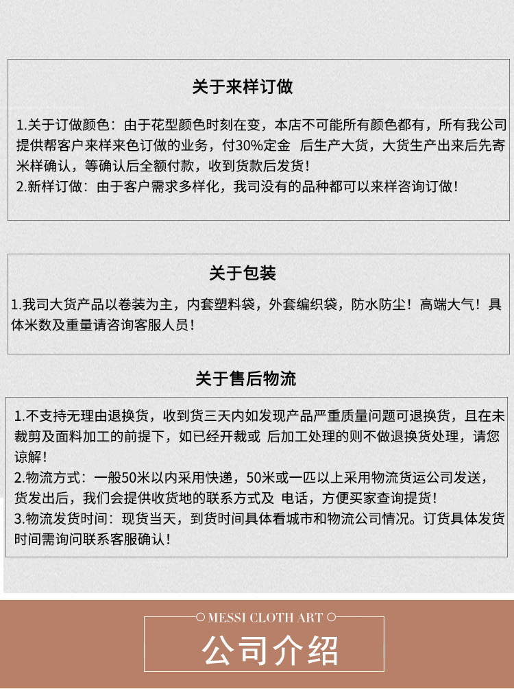 (注:本店所有产品都是空差97,也就是每匹布100码少3码/100米少3米,以此推类。散剪一律不退换,对于色严格可以先寄大货样。本公司量大从优!所有产品,如发现质量问题,应于交货之日起三天内与公司联系,协商解决,一经裁剪或超出本期限。非质量问题,散剪一律怒不退换,谢谢合作)