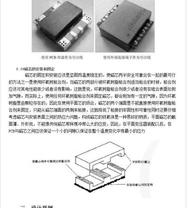 磁芯的固定和安装应该是坚固而温度稳定的。使磁芯两半安全可靠合在一起的最可行的方法之一是使用环氧树粘合剂。当磁芯的两部分被环氧树脂粘合剂适当粘合的时候,粘合剂应该对其电性能很少或者没有影响。这就是说,环氧树脂粘合剂很少或者没有在啮合表面处附加气隙。而实际上,使用任何环氧树脂粘合剂来固定磁芯,都会附加有一定的气隙,因为环氧树脂是由颗粒存在的,因此在使用平面芯的场合,磁芯的两个端面是不能直接使用环氧树脂粘合剂来固定,只能从磁芯端面的两侧来粘接,这就降低了粘接的牢固性和可靠性同时还要仔细考虑磁芯与安装表面之间的热应力问题。构成磁芯的铁氧体是一种易碎的物质,平面磁芯的截面薄、外形低,不能像传统磁芯那样缓冲那么大的应变,因此,在平面变压器装配以后,在PCB与磁芯之间应该保证一个小的问隙以保证在整个温度变化中有最小的应力