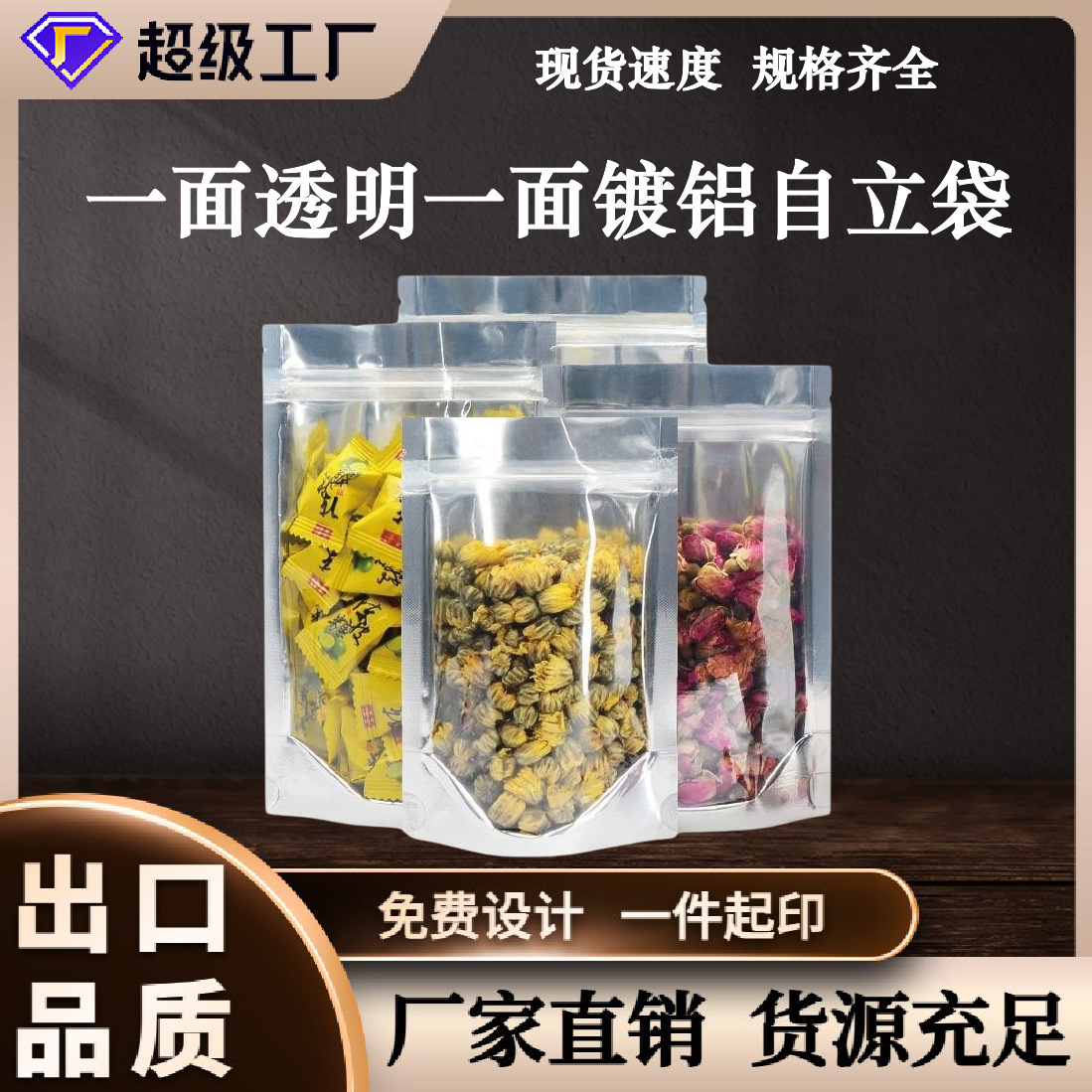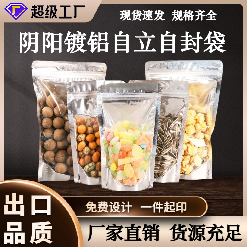 現物アルミメッキ陰陽自立自封袋レジャー食品ジッパー袋半透明アルミ箔プラスチック包装袋卸売り