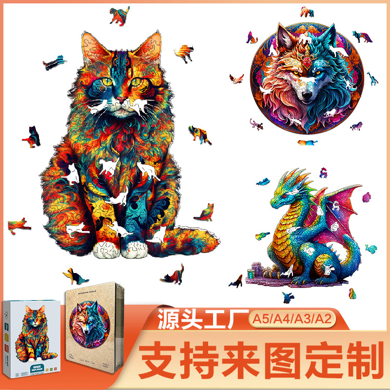 国境を越えたソースメーカー卸売り異形動物木製パズル不規則な3d立体アマゾン猫玩具