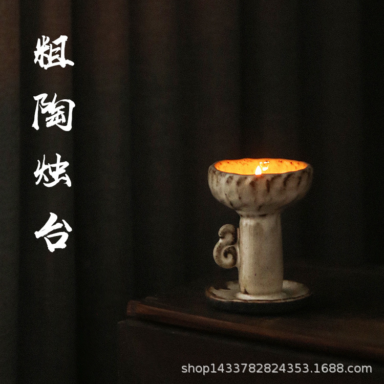 粗い陶器の燭台の手は古風で質朴な陶器の黒い陶器のろうそくの燭台の灯台の中国式の復古の陶土の茶席の置物を握ります。