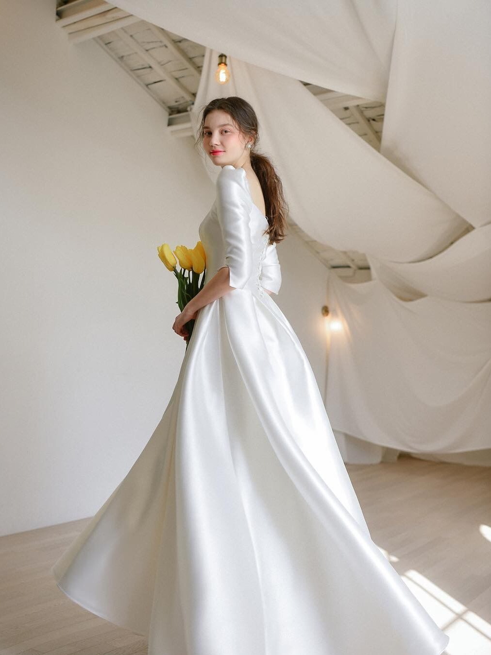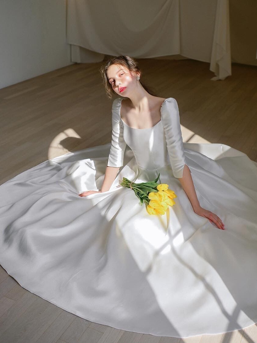 軽やかなウェディングドレス フレンチスタイル ヘップバーン風 2024年新作 シンプル フォレスト系ウェディングドレス 旅行撮影用 細見え効果のある花嫁用 ロングスリーブ ロングドレス