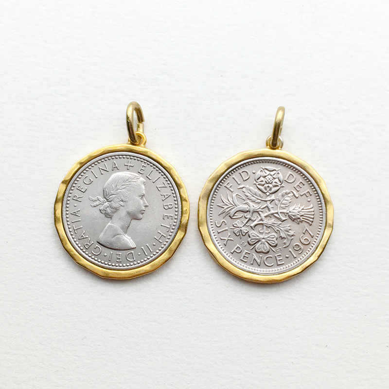 イギリスの六ペンスの硬貨と枠の縁のペンダントのレトロな人は金の銀色の中古のネックレスの大衆のアクセサリに似ています。