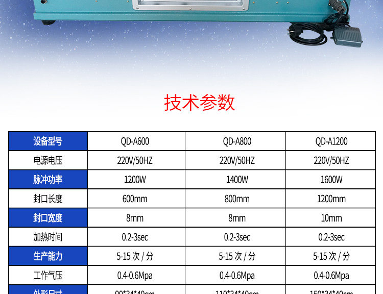 型号:QLF700A 电源电压: AC 110/220V, 50-60Hz 功率(W) :2000W 空气压缩机: 用户自备 印字类型:热打码 温控范围:0-300°C 封口速度:2-20次/分 封口长度: 700mm 封口宽度:8-10mm 封口中心到地面尺寸: 1120mm 薄膜厚度(单层):≤0.2mm 包装袋高度 :300-750mm 最大封口载荷(载重量):50Kg 压头可调角度:20° 机器尺寸(L×W×H) :720×560×1340mm 机器重量:100Kg
