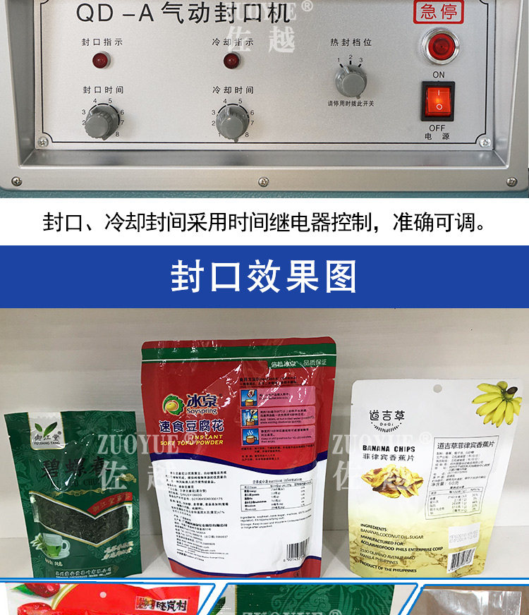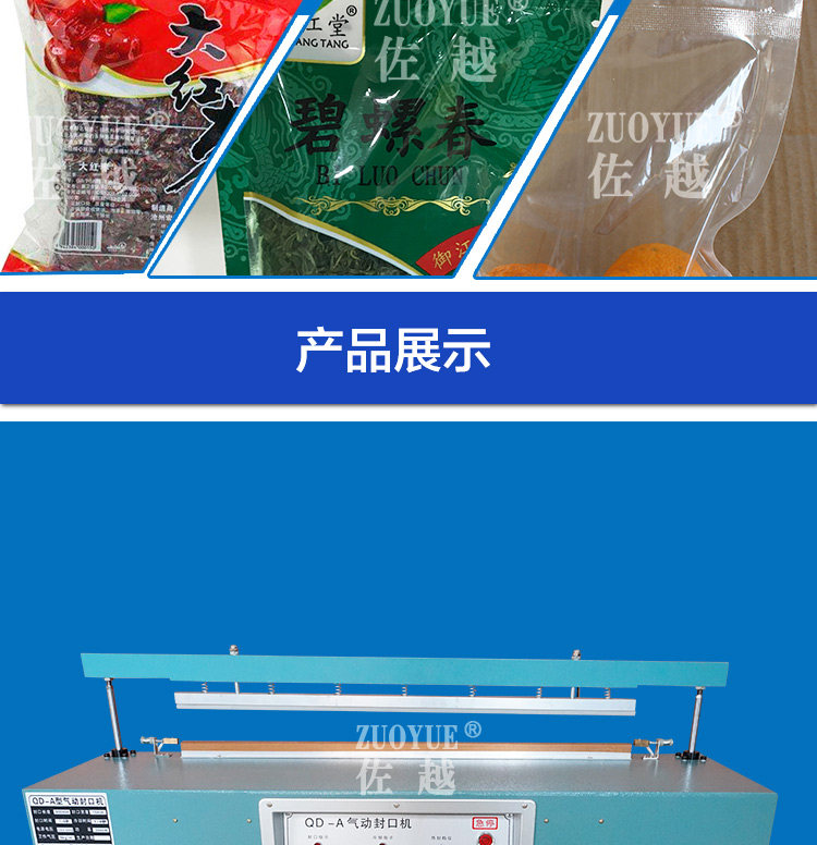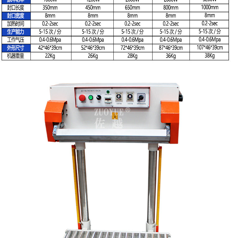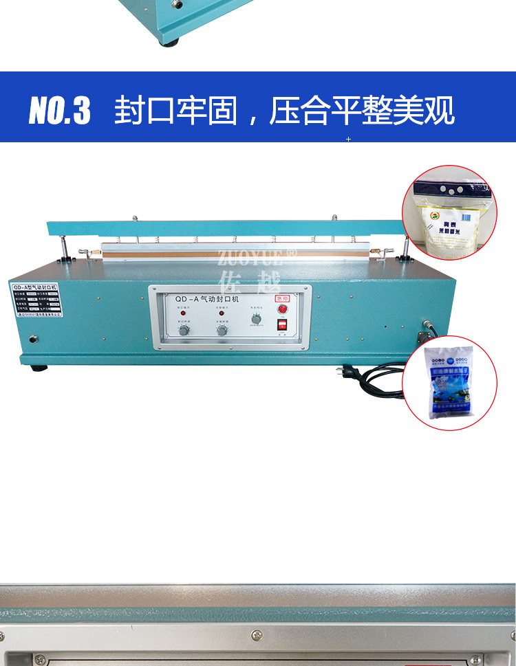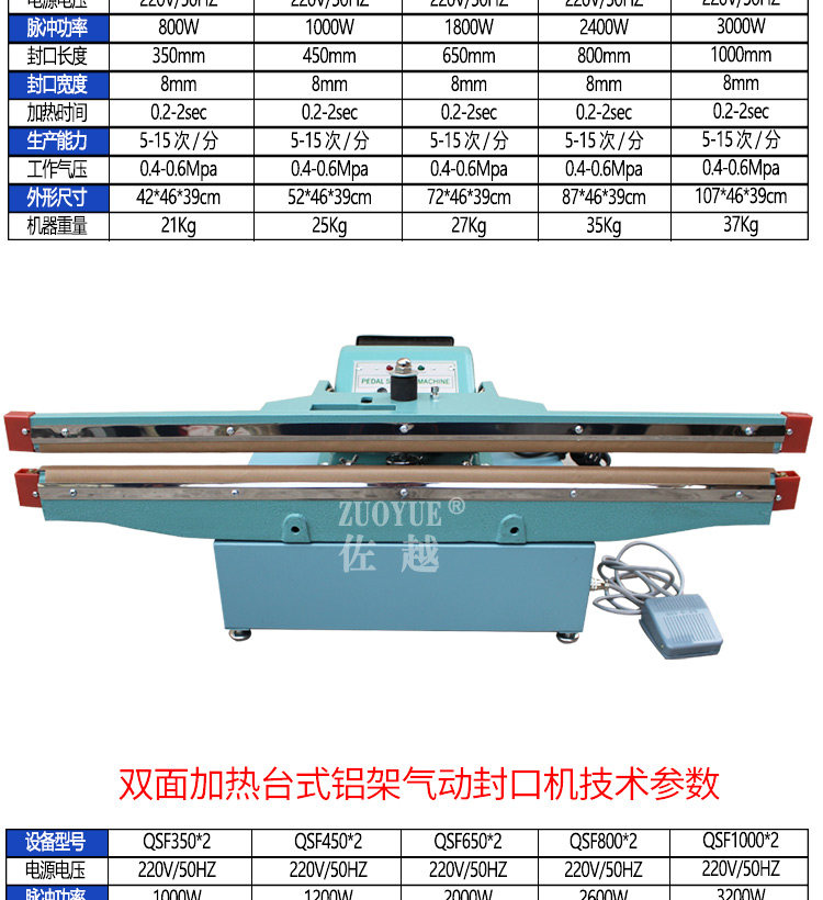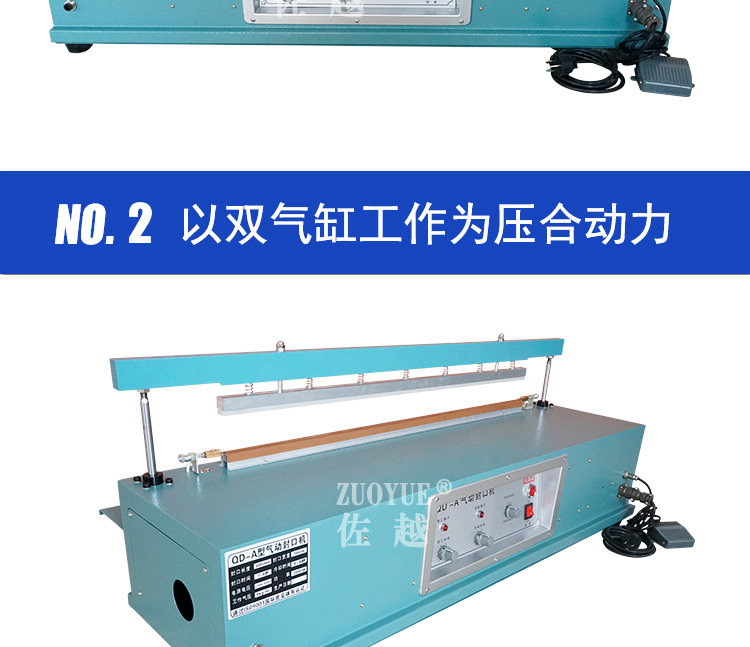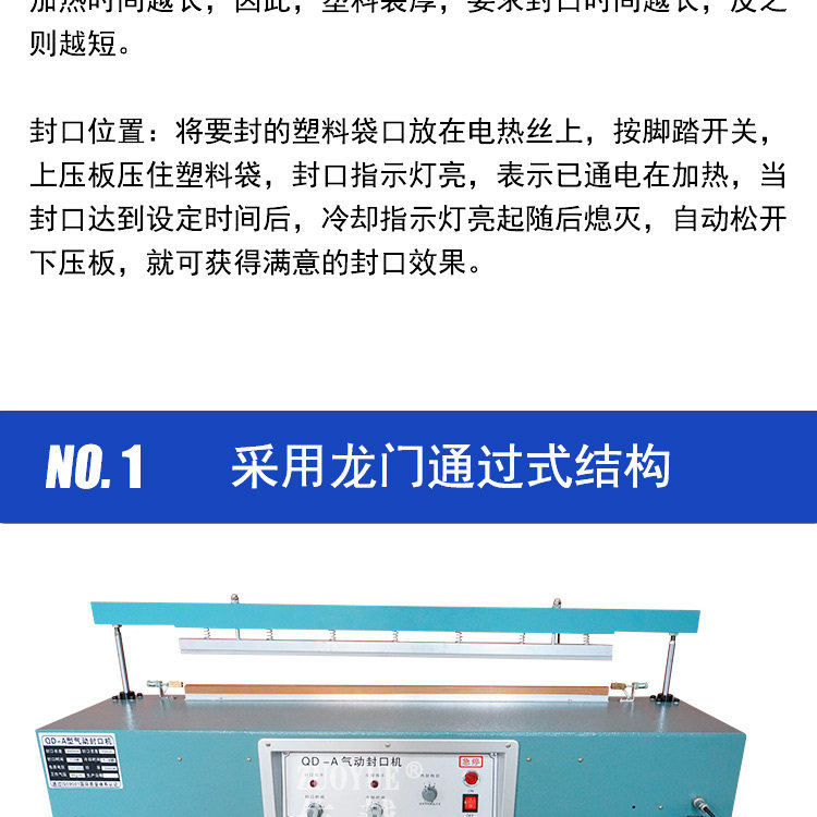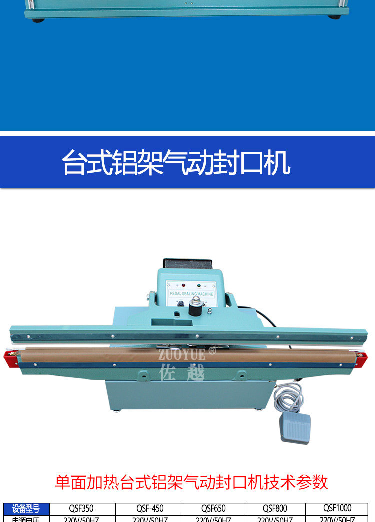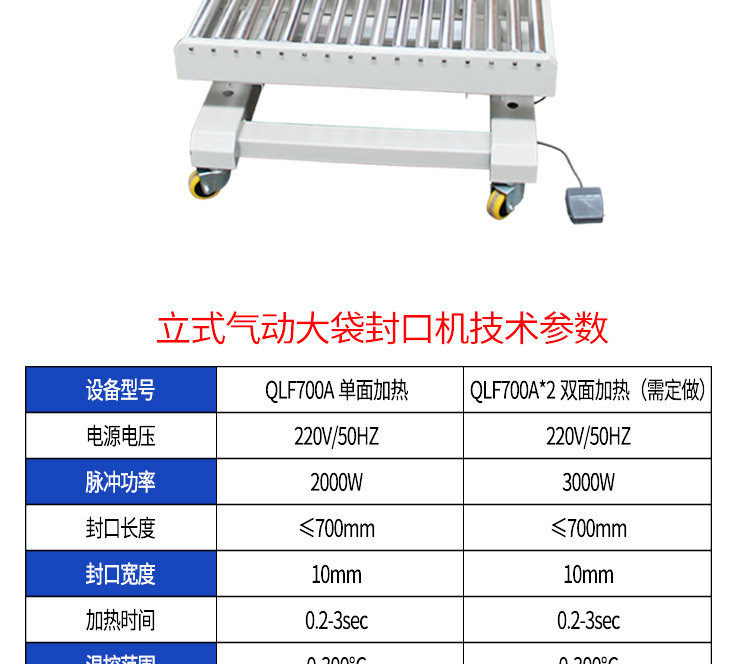 型号:QLF700A立式气动塑料薄膜大袋连续封口机,该机适用于封口长度小于700mm、重量小于50Kg的塑料袋或复合袋的间歇包装封口。该机采用压缩空气作动力,封口压力可调,质量稳定可靠,可以手动或脚踏开关操作,轻便简易。在化工、粮食、食品、饲料等行业得到广泛应用。特殊订货可将封口长度增大至800mm、1000mm,也可以与其连接的输送台和生产流水线配套。