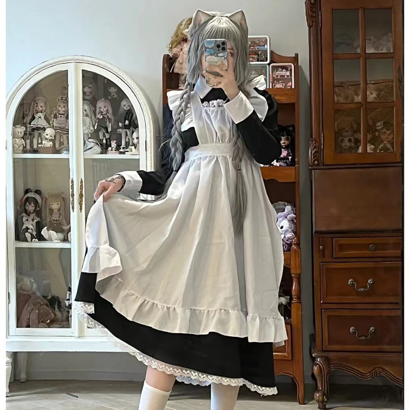 新しいロリータロングプラスサイズメイド服黒日本レースメイド服カフェかわいい日本メイド