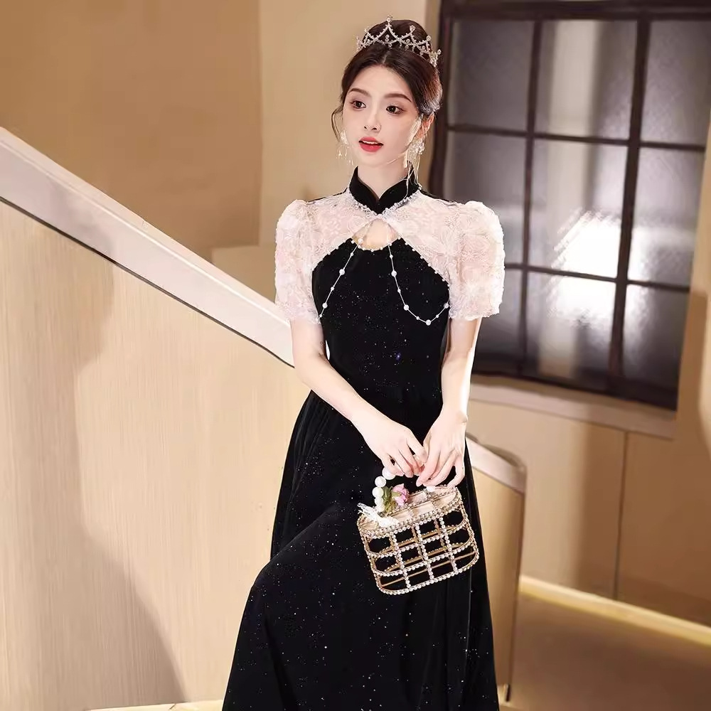 黒いチャイナドレスの女性2025新型中国式成人式宴会の軽豪華な大衆司会者のドレスのスカート