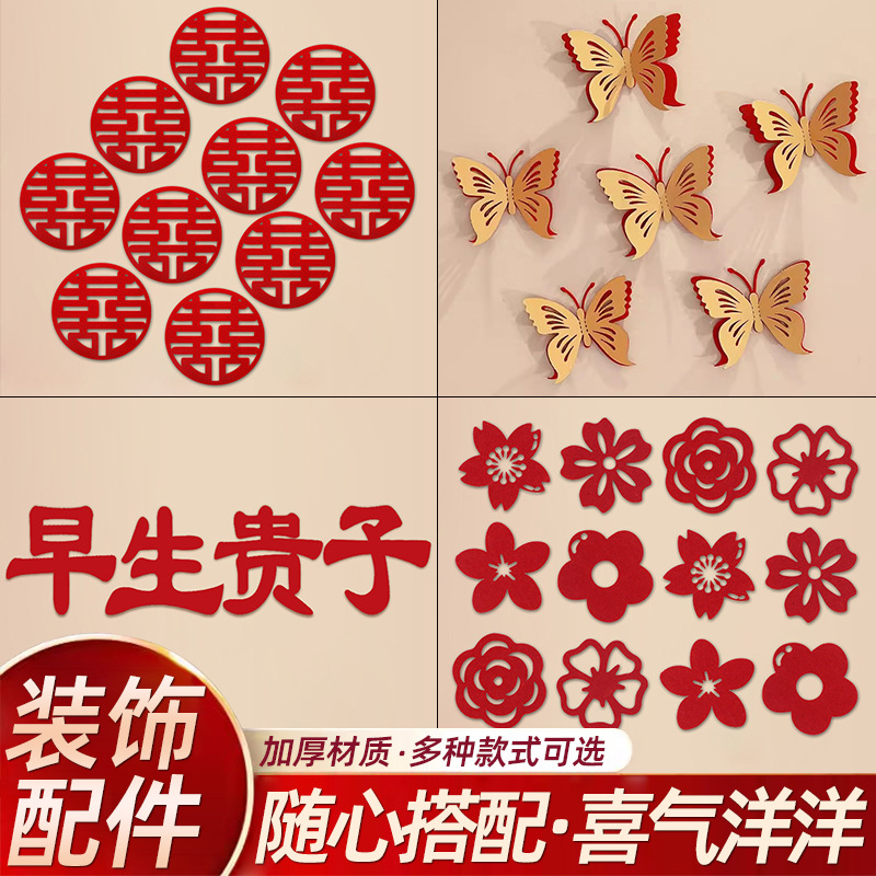 結婚立体シミュレーション赤い蝶のウェディングルームの装飾寝室のリビングルームの背景壁に結婚式のウェディング用品を配置します。