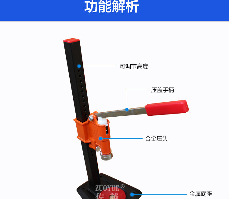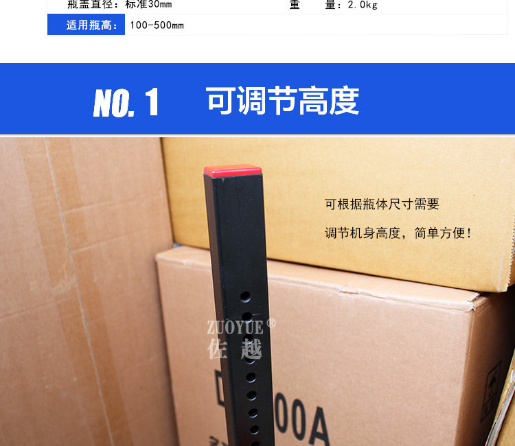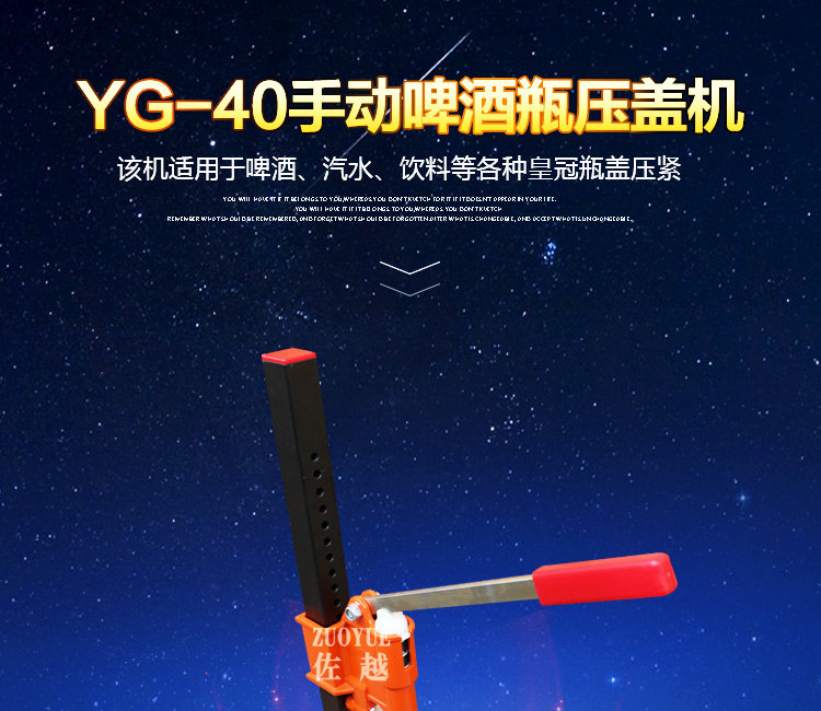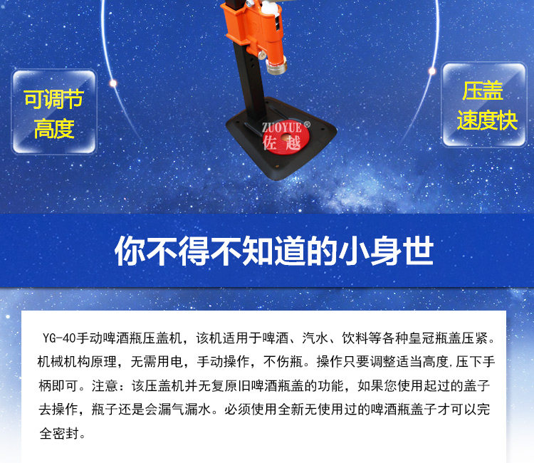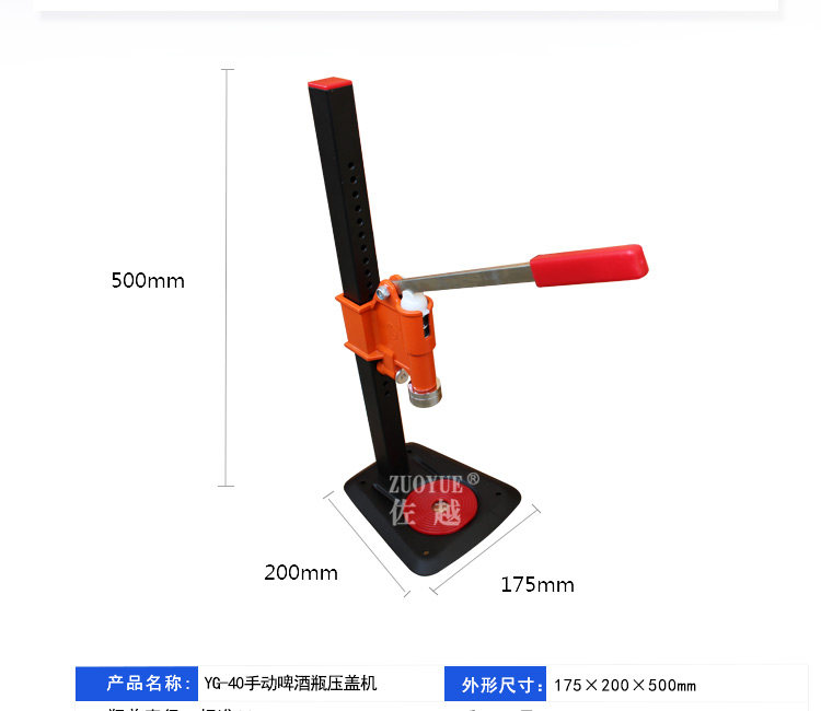 型号:YGA-1 电动皇冠盖压盖机适用于各种皇冠盖瓶盖的压盖之用,如白酒、啤酒、汽水等饮料的封口包装生产;机械机构原理,电动操作,简单方便,不伤瓶口。