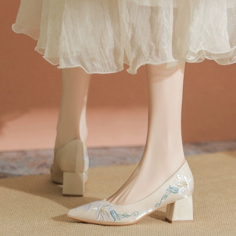 新しい中国風の刺繍入り女性用靴 2025 新しい明るい色のドレス付き女性用靴、疲れない足のチャイナドレスハイヒール