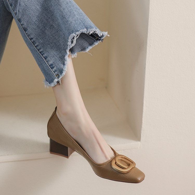 フランス風レトロな馬革バックルハイヒール、2025年春新作、スクエアトゥ、浅履き、太ヒール、レディースシューズ、海外販売向け