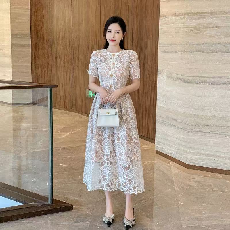 気質修身レーススカート2025春夏新作フランス高級感透かし彫りフック花水溶レースワンピース