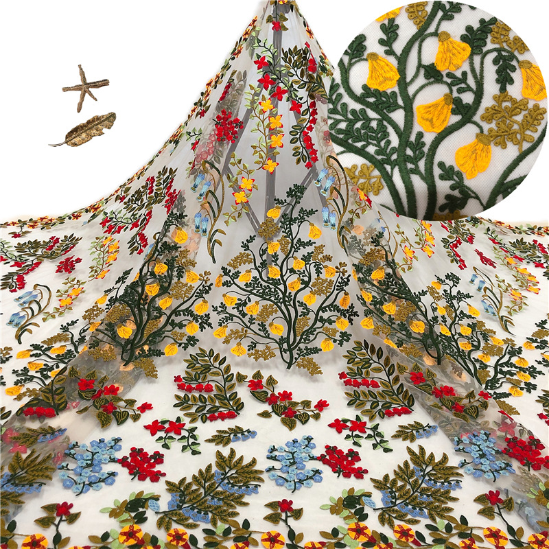 杏色蕾丝网纱布料民族风多色叶子花型珠片亮片刺绣面料服装连衣裙